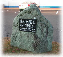 | ベンチの脇に立つ、会社創立50周年記念石 |